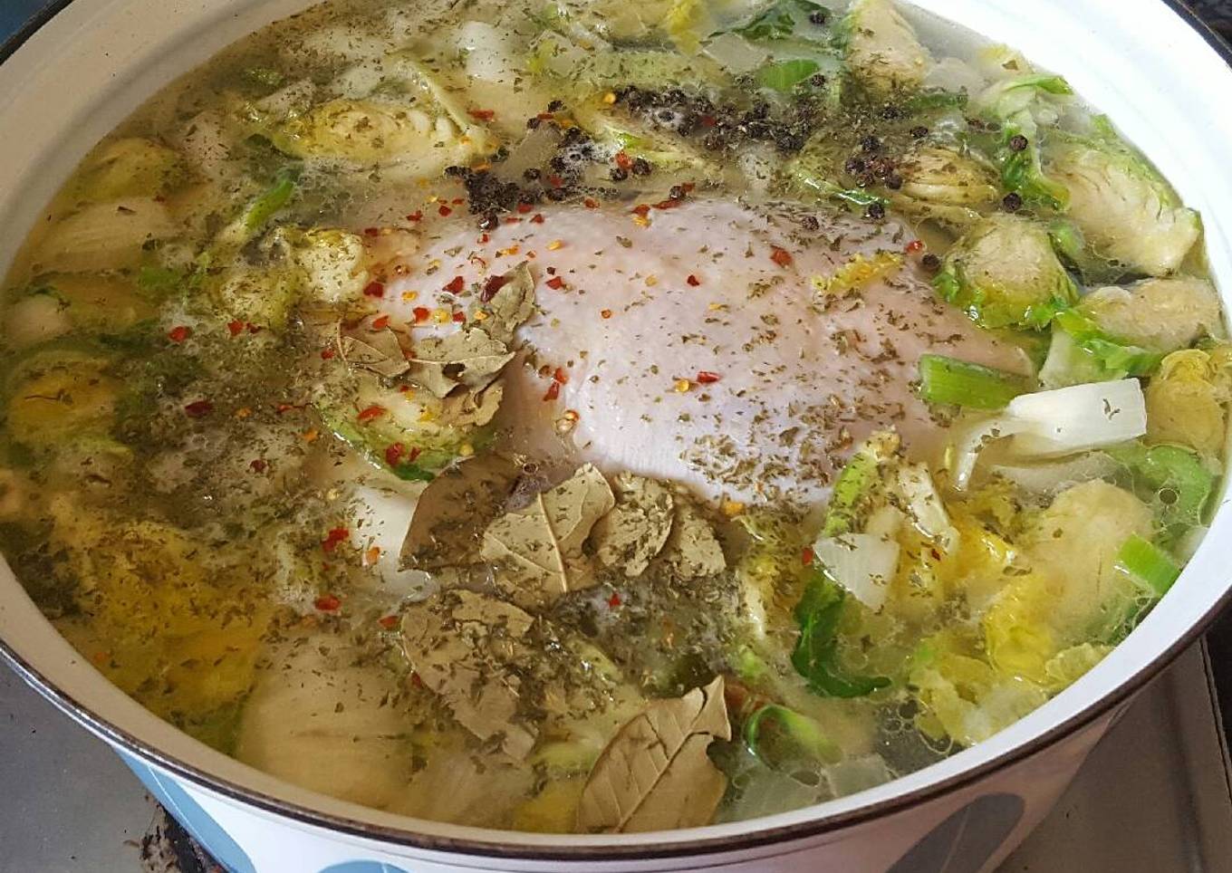 - Cook for about an hour, remove the bird, strip the meat and set aside, put all the skin and bones back in the pot. Cook 2 more hours.