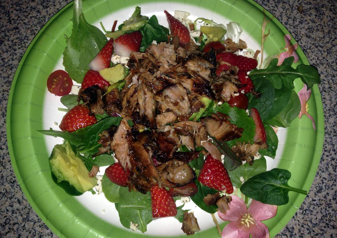 - Add salad mix, shaved ribs, cherry tomatoes, strawberries, avocado and feta cheese on plate.